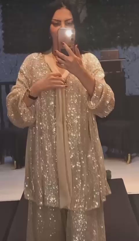 Compleul DIVA75 aduce un plus de eleganță oricărei apariții. Realizat din material fluid, acoperit integral cu paiete fine, modelul oferă o strălucire sofisticată fără a compromite confortul.