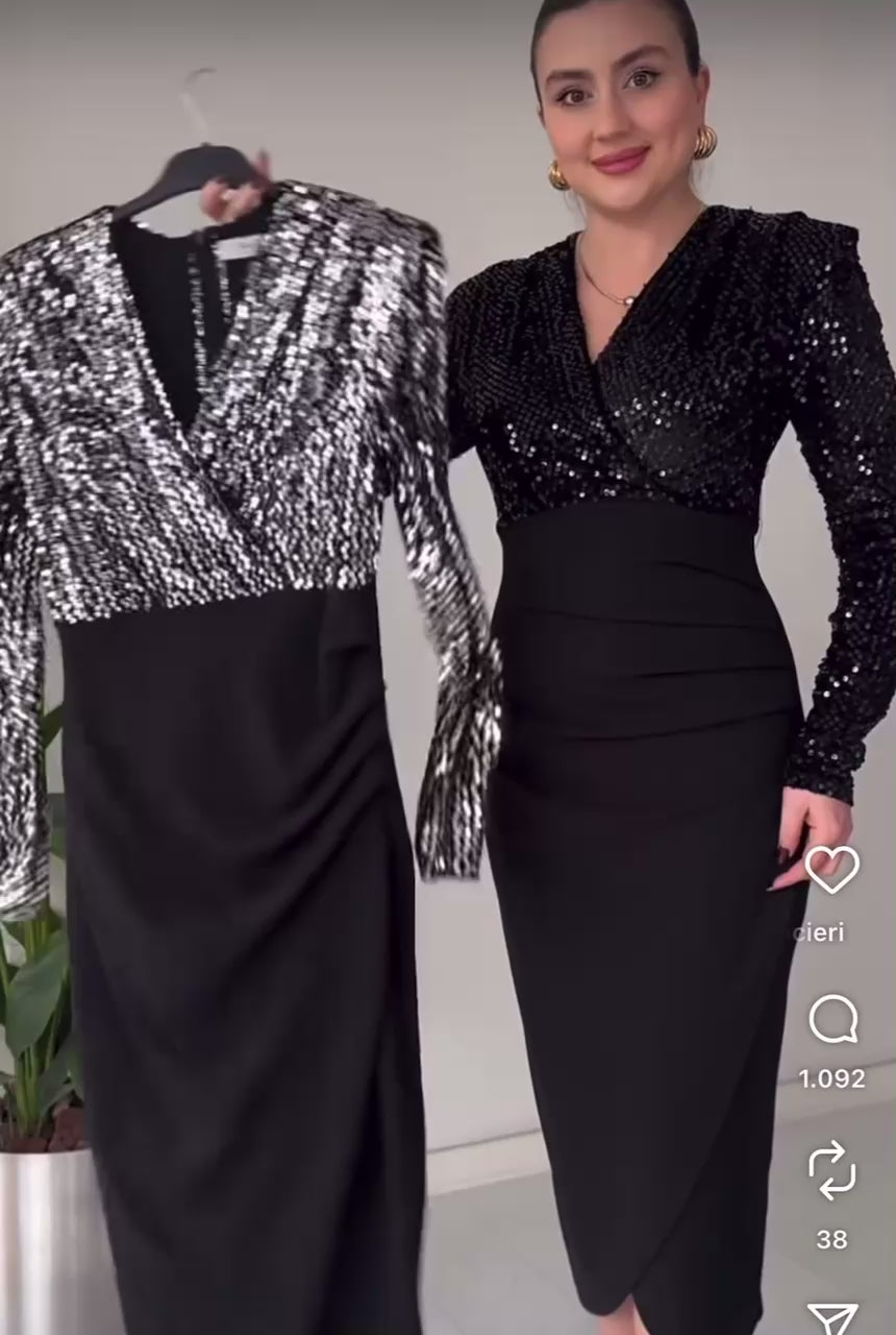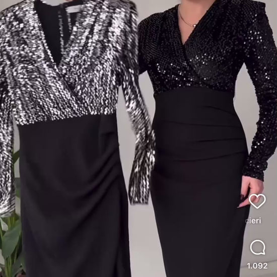 Rochie elegantă midi, cu design rafinat și modern. Partea superioară este realizată din paiete ce adaugă strălucire și feminitate, având un decolteu petrecut care evidențiază delicat bustul. Talia este marcată frumos, iar fusta neagră tip creion oferă o siluetă alungită și sofisticată. .