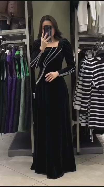 Adaugă un plus de rafinament garderobei tale cu această rochie spectaculoasă din catifea. Designul elegant, cu umeri ușor evidențiați și mâneci lungi, este pus în valoare de aplicațiile strălucitoare dispuse pe diagonală, care creează un efect vizual unic și subliniază frumusețea croiului.