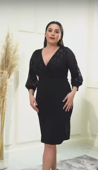 Alege o ținută care îmbină rafinamentul cu strălucirea! Această rochie elegantă midi, cu decolteu în „V” și croială conică, pune în valoare silueta și adaugă un plus de feminitate. Partea superioară este realizată din material cu paiete delicate, ce reflectă discret lumina, oferindu-ți un look sofisticat la fiecare pas.